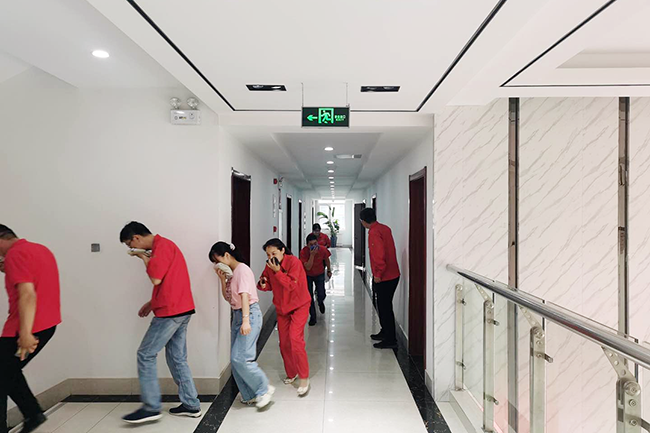公司首先在辦公樓進行了消防疏散演習(xí)。上午8:30,隨著警報響起,撤離命令第一時間由專人傳達至辦公樓每個在崗員工,大家立即沿著指定路線快速疏散,有序撤離到安全地帶。