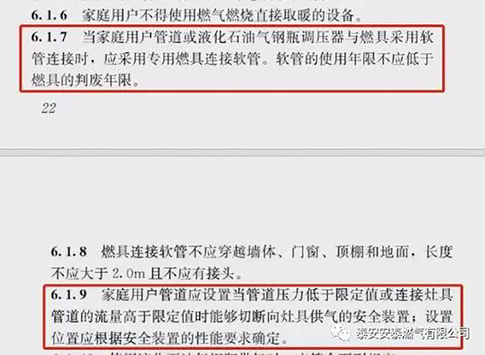 細心閱讀會發(fā)現其中第6.1.7條款對于燃氣連接軟管的要求出現了很大的新變化:“當家庭用戶管道或液化石油氣鋼瓶調壓器與燃具采用軟管連接時,應采用專用燃具連接軟管。軟管的使用年限不應低于燃具的判廢年限”。