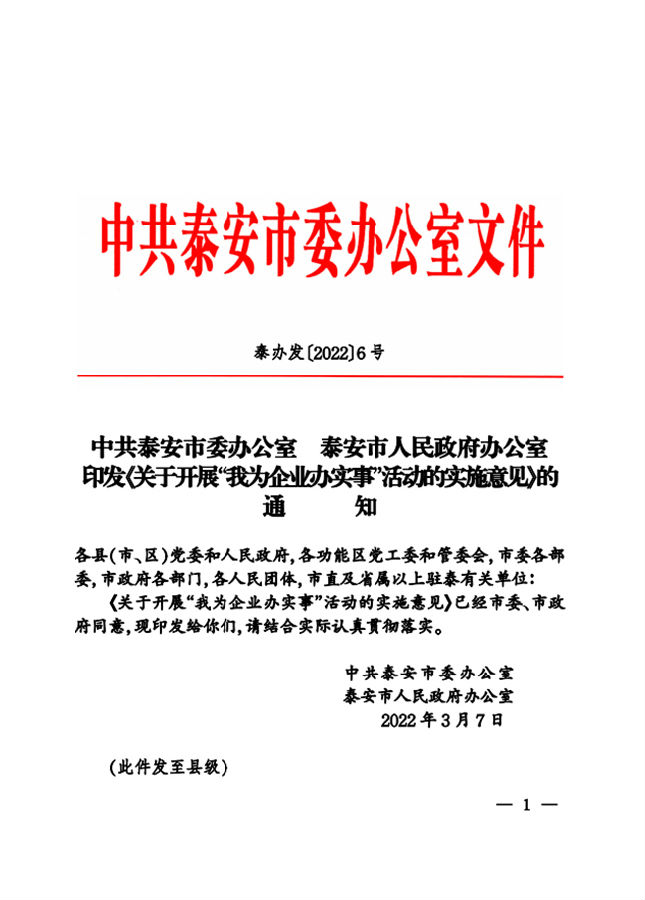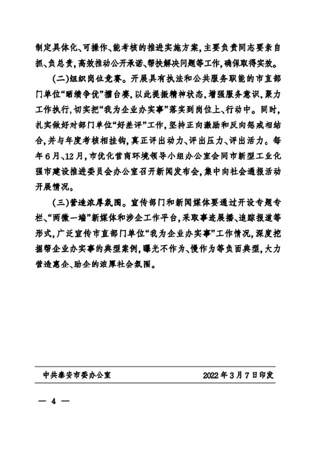 中共泰安市委辦公室泰安市人民政府辦公室印發(fā)關(guān)于開展我為企業(yè)辦實事活動的實施意見的通 知